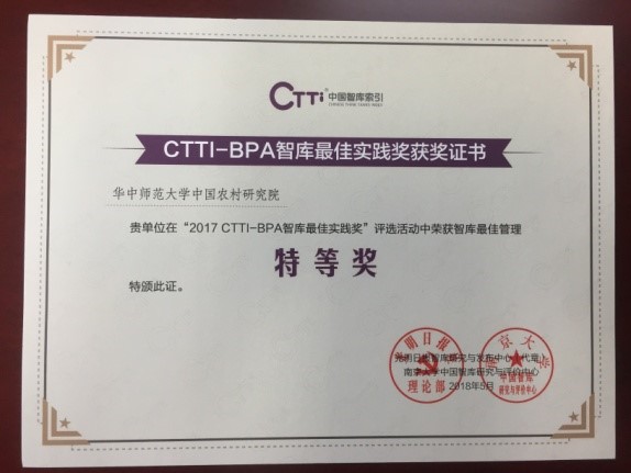 据了解,2017 CTTI-BPA智库最佳实践案例评选是光明日报智库研究与发布中心、南京大学中国智库研究与评价中心联合发起,依托中国智库索引-CTTI并结合专家评审进行的。据统计,共有23个省市自治区441个项目进行了申报,经过在线通讯评审,最终78项申报入围。经过专家组举行终评会,投票表决出51件入围2017CTTI-BPA最佳案例,中国农村发展智库平台获最佳管理奖类特等奖。