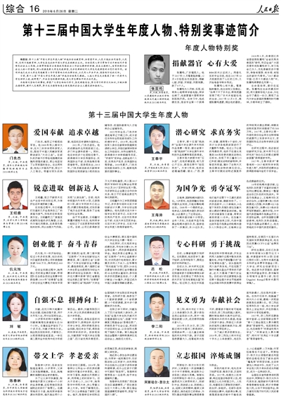 带父上学,孝老爱亲。我校物理科学与技术学院2017级本科生陈春林荣获第十三届大学生年度人物称号。6月26日,《人民日报》整版推介了第十三届“中国大学生年度人物”先进事迹,入选大学生充分展现了新一代青年大学生好学上进、视野宽广、开放自信的精神风貌,是大学生群体中的杰出代表。