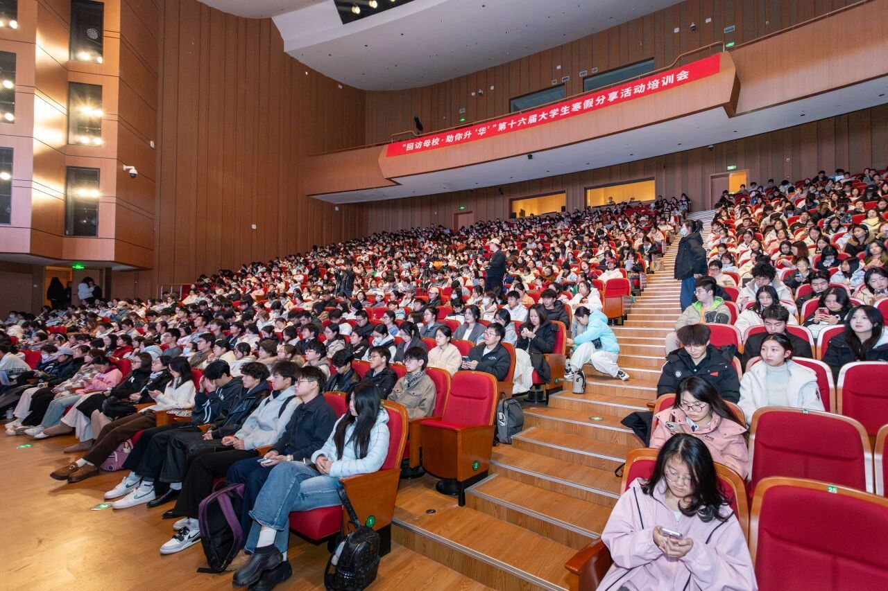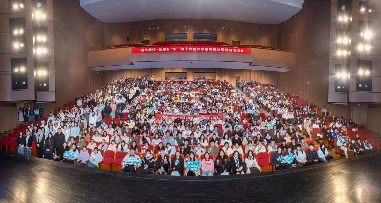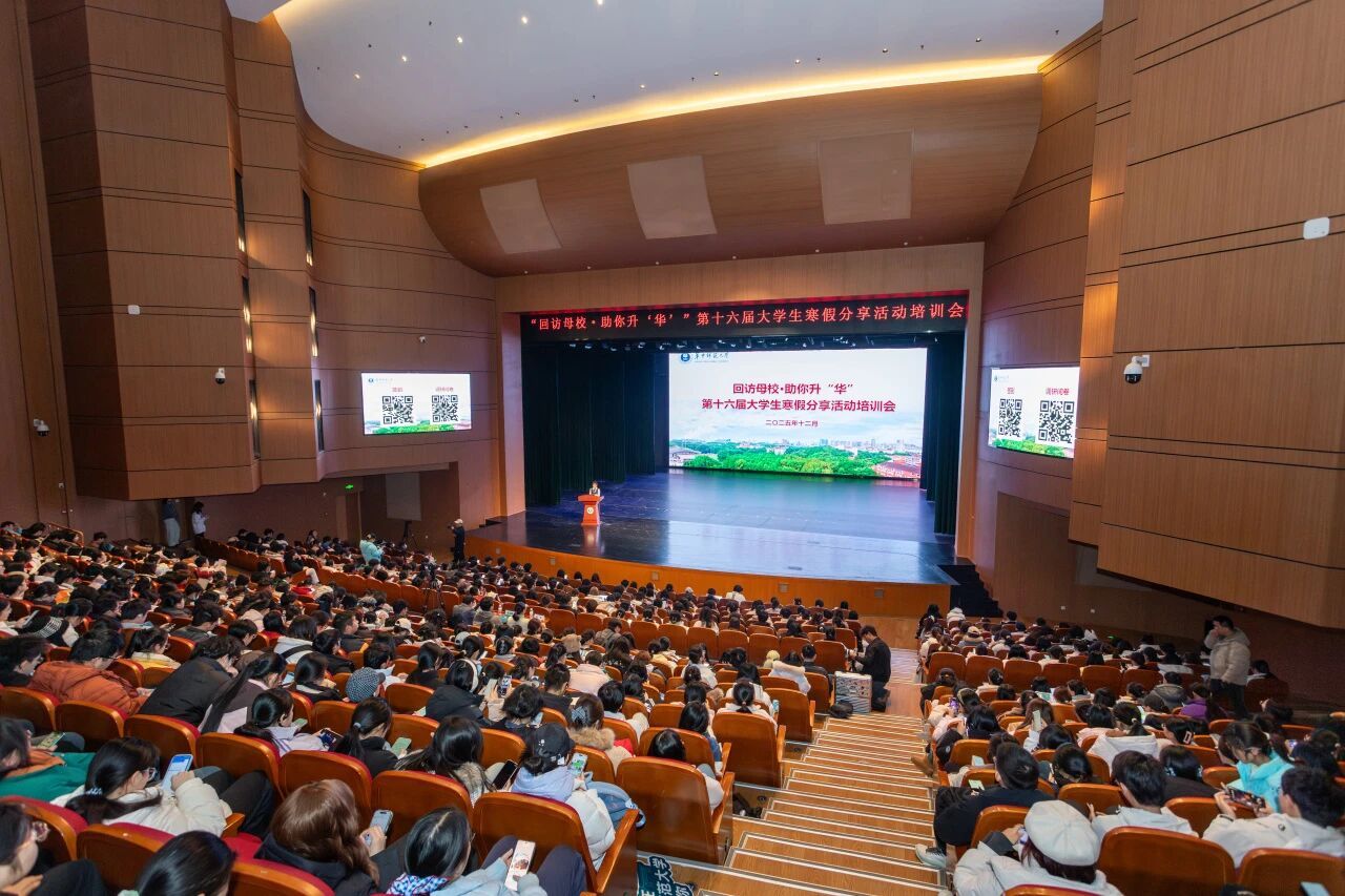 12月17日下午,“回访母校,助你升‘华’”华中师范大学第十六届大学生寒假分享活动培训会在大学生活动中心大礼堂召开。校团委志愿服务部部长、青年志愿者联合会指导老师赵凌峰,本科招生办公室招生项目主管张爱、曹世生参加活动。来自第十六届寒假分享活动参与团队、第十五届寒假分享活动优秀团队、第十五届寒假分享活动梦想约定“圆梦之星”的近1000名代表参会。