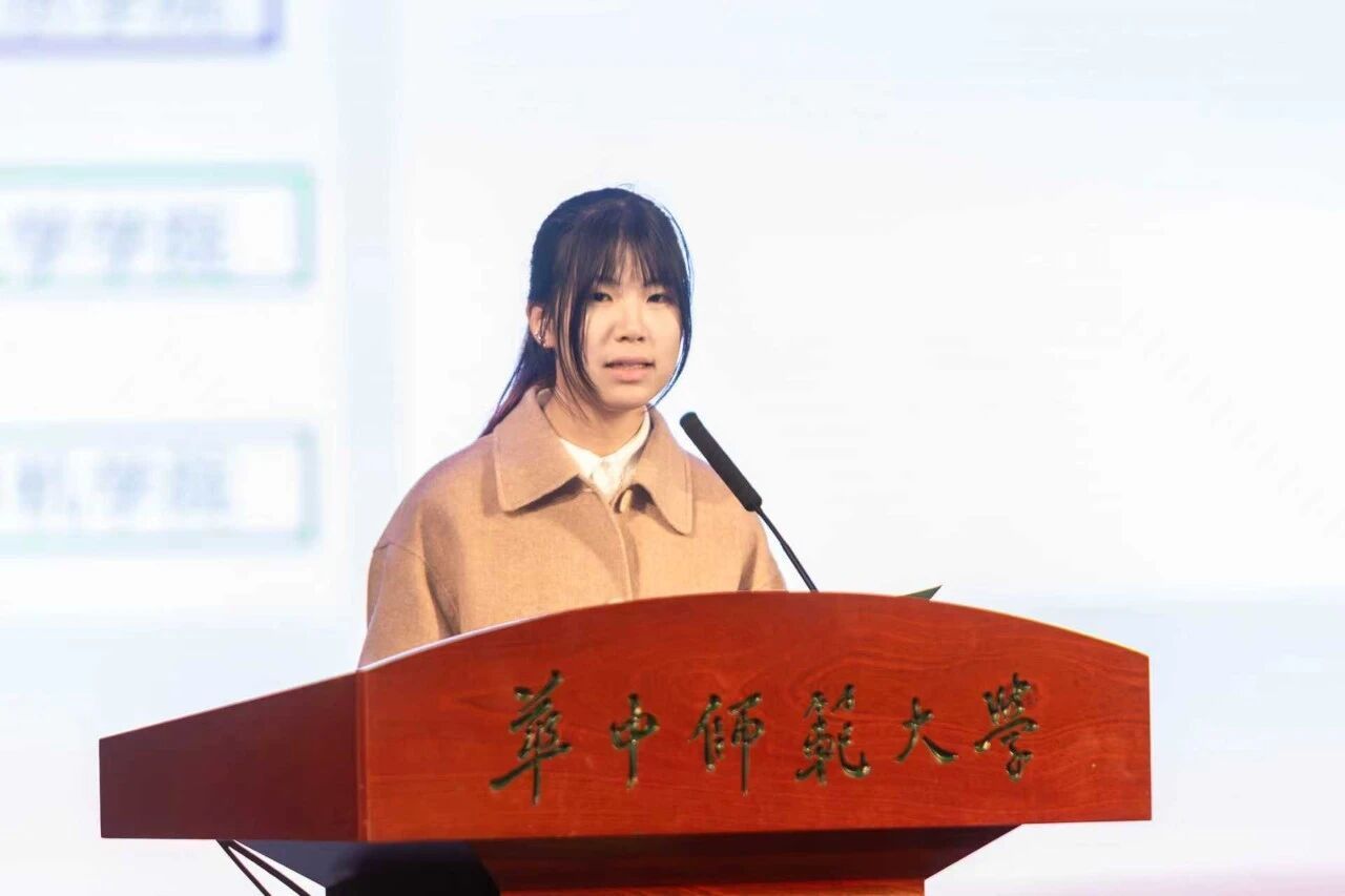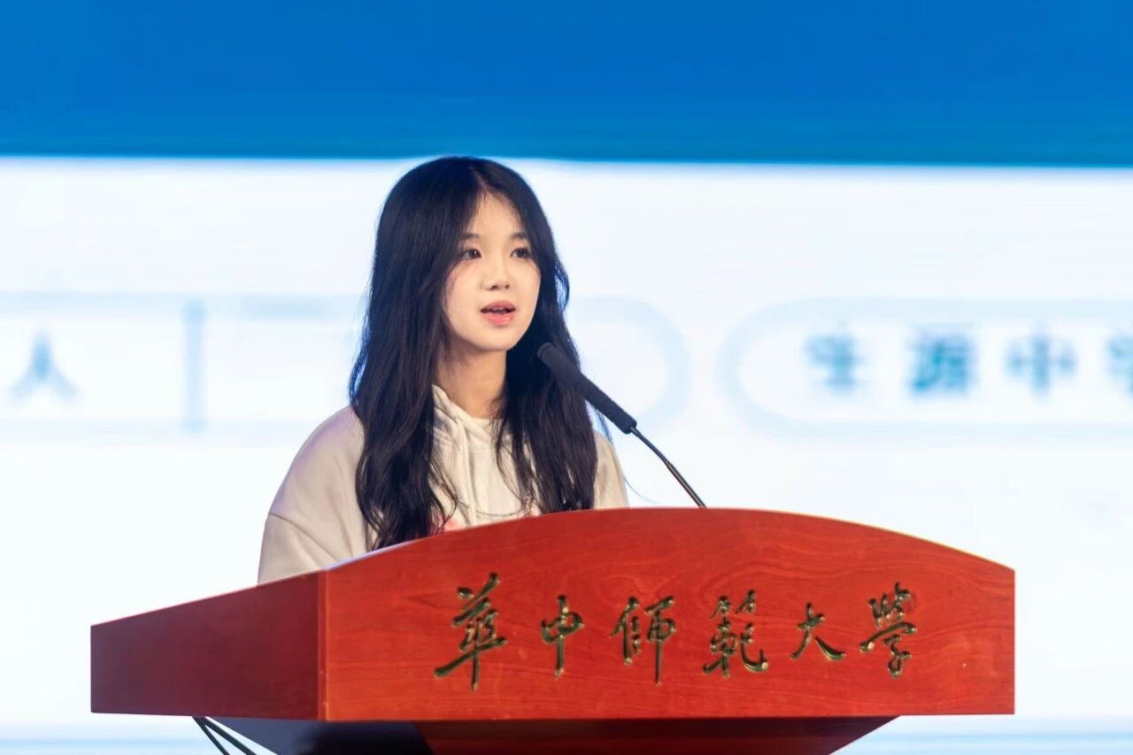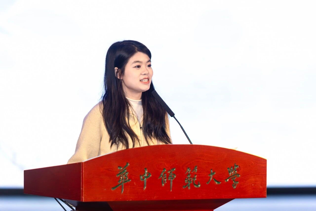 来自湖北省荆州中学、现就读于外国语学院的2025级新生蔡卓庭作为第十五届寒假分享活动“圆梦之星”代表讲述了自己的圆梦经历。她回顾了自己因第十五届寒假分享活动的华师学长学姐到班宣讲而萌生“上华师,当老师”梦想的经历。受家庭教师氛围和班主任鼓励的影响,这一梦想日益坚定。高考后,她选择进入华师英语公费师范专业。在华师学习生活的这段日子里,“求实创新、立德树人”的校训、温暖的校园文化与师风传承,让她深切感受到教师职业的崇高。如今,她作为队长带领团队筹备此次寒假分享活动,希望将最真实的成长体验与鼓励传递给母校学子,带着温暖、笃定与自信,让桂子山的桂香飘回学弟学妹的书桌前,让每个努力的人,都能找到属于自己的方向。