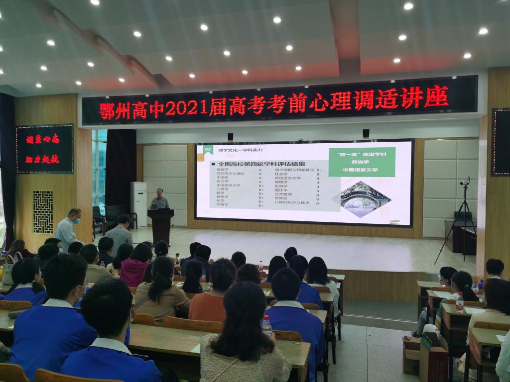5月23日,招生与就业工作处副处长曾艳梅,心理学院副教授田媛,本科招生办公室张德华一行赴鄂州高中开展招生宣传工作。通过线上和线下的方式向鄂州高中高三全体学生开展了《高考前心理调适讲座》和招生政策的宣讲。