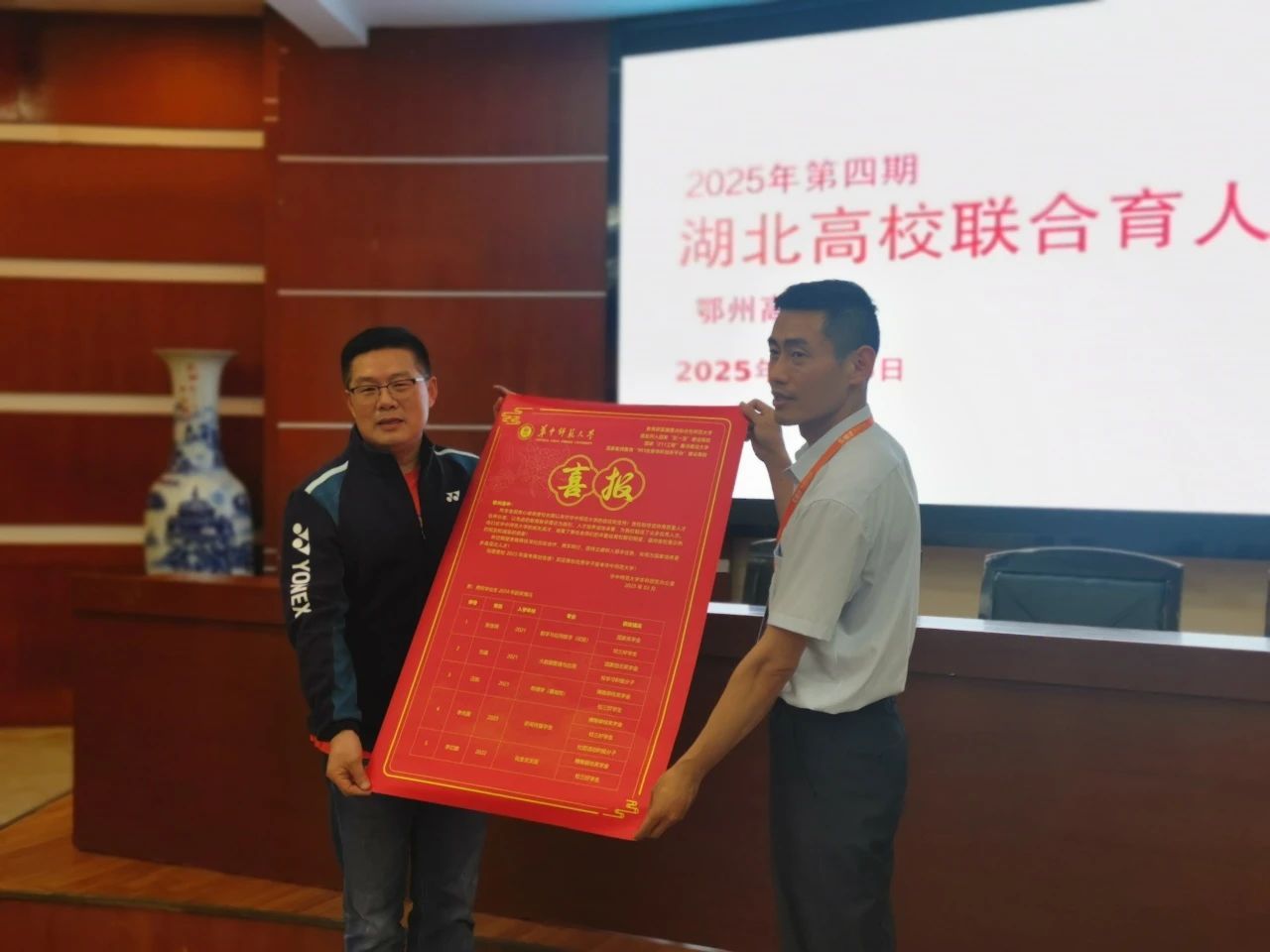 陈晓宇代表学校向鄂州高中递送喜报,感谢鄂州高中多年来持续向华师输送高质量生源,并对鄂州高中毕业学子在我校的成长与发展表现给予高度肯定。陈晓宇表示,期待两校继续加强沟通协作,筑牢“大中衔接”基础,共同发挥高中与高校在协同育人上的社会功能,为国家和社会培育更多优秀人才。