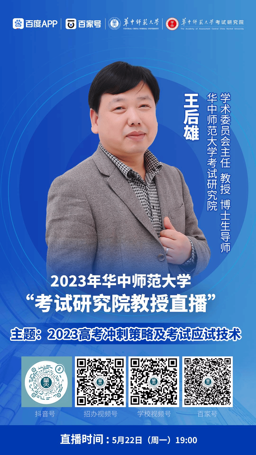 王后雄,考试学博士,特级教师,教授,博士生导师。现任华中师范大学考试研究院学术委员会主任、化学教育研究所所长、湖北省教育信息化规划编制专家组成员、K12在线教育专家学术委员会常务副主任,国家首批培训专家成员,系国家中考、高考质量控制及标准评价课题负责人,大型教育考试及学科竞赛命题人。主要从事教法、学法、考法及教学诊断与质量提升等研究,主持国家及省部级科研项目10多项,著有专著及教材40多部,先后在SSCI、CSSCI及核心期刊发表教育教学论文500余篇,先后评价为在教育学、考试学领域成为学术论文成果最多的学者。