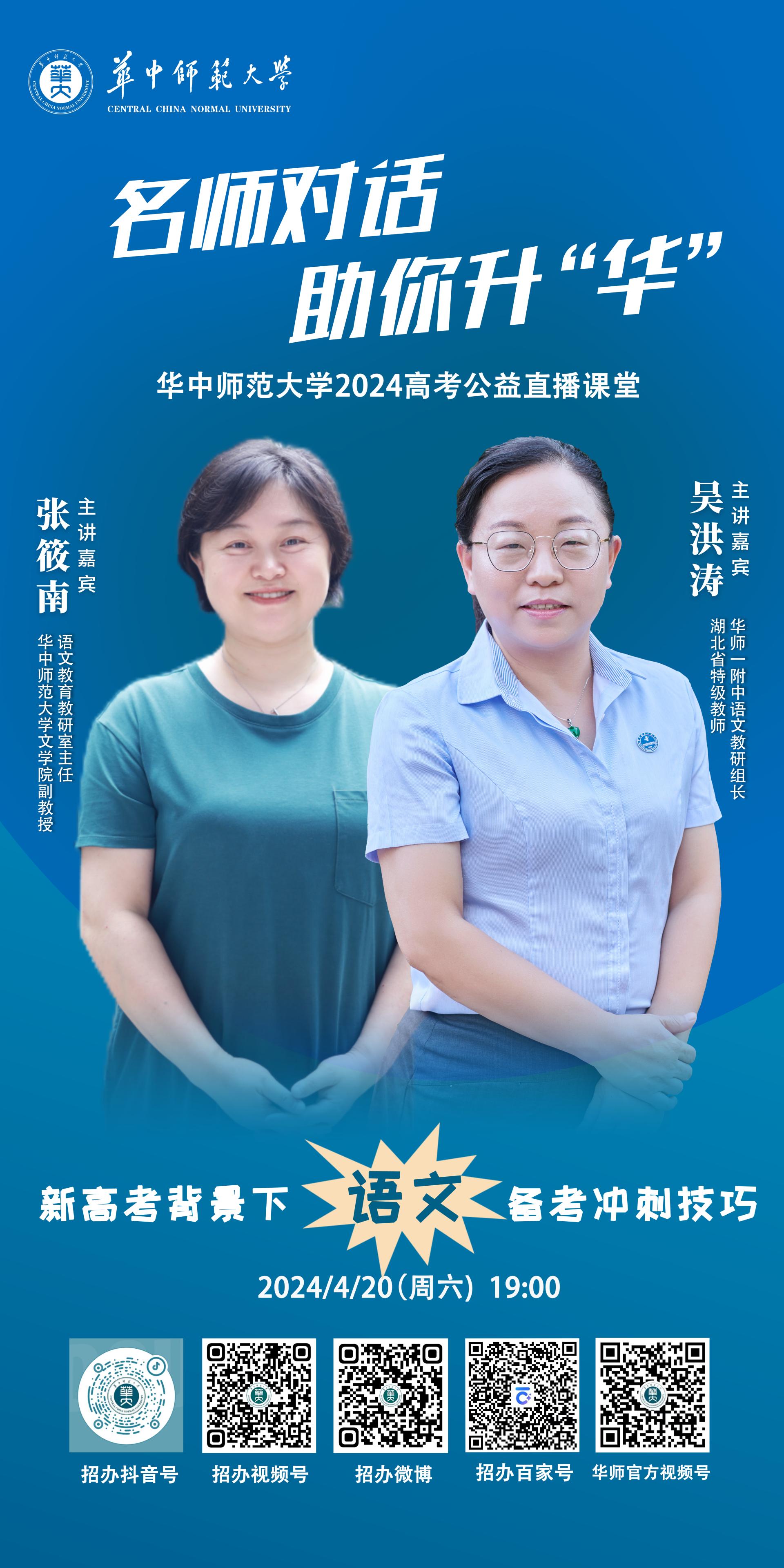 2024年高考在即,为响应考生家长对备考指导的期盼,进一步实现优质教育资源共享,助力广大考生科学有效备战高考,华中师范大学本科招生办举办的“名师对话 助你升‘华’”2024高考公益直播课堂即将于4月下旬开播。该课堂邀请华中师范大学专家教授与华师一附中学科名师开展对话,共同分析高考形势,讲述备考策略,传授冲刺经验,解答考生家长疑惑,助力青年学子高效备考。