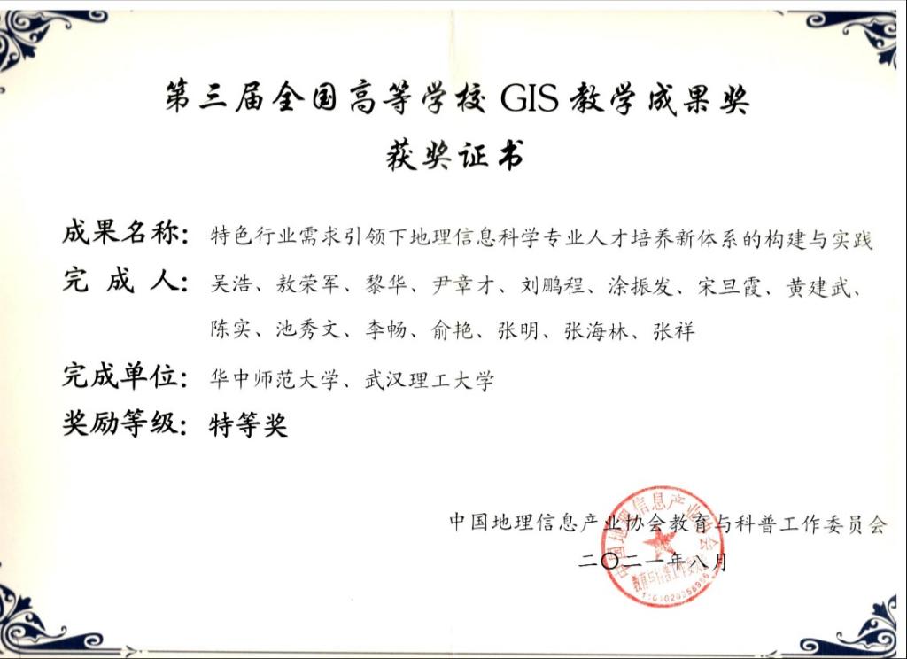 地理信息科学专业现有专业教师17人,100%教师具有博士学位。其中:教授6人,副教授10人,讲师1人,其中,国家级人才1人,省部级人才3人,具有海外经历的教师比例100%、从事一线本科教学工作教授占比100%等。本专业老师主持了国家科技部重点研发计划课题、国家自然科学基金联合基金重点项目、并荣获中国地理信息科技进步一等奖、中国测绘科学技术二等奖、湖北省科技进步二等奖、美国摄影测量与遥感学会(ASPRS)特等奖和一等奖等。通过科研反哺教学,荣获国家教学成果奖二等奖、全国高校GIS教学成果奖特等奖、并形成了“学训赛创”四位一体的人才培养体系,指导学生连续四年获得国内规模最大、水平最高的国家级GIS学科竞赛特等奖——全国大学生GIS应用技能大赛,以及ESRI杯全国大学生GIS竞赛一等奖和二等奖等。