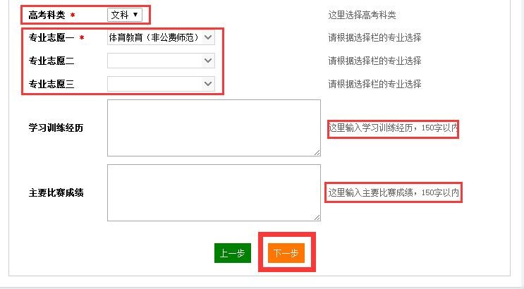 9.其余省份考生须选择“高考科类”、“专业志愿”,填写“学习训练经历”和“主要比赛成绩”,点击“下一步”