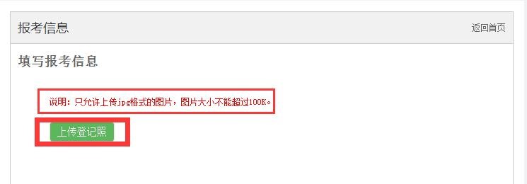 6.填写“报考信息”,上传考生证件照,请注意:文件格式应为JPG格式,文件大小不大于100KB。