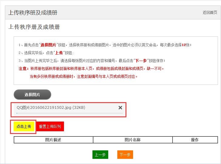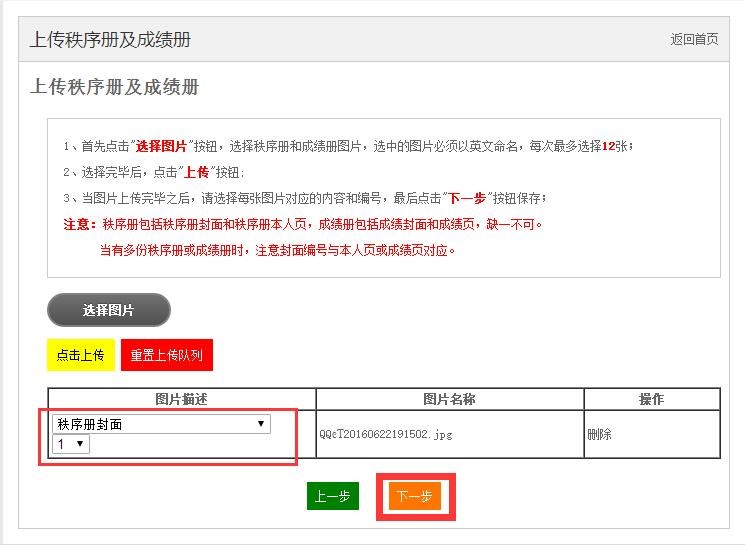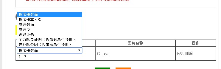 11.上传报名材料,点击“选择图片”→ 点击“点击上传”→ 点击下拉框选择图片内容名称和编号,考生需上传等级证书、成绩册、秩序册扫描件(仅需封面和考生本人页),主力队员证明(仅篮球考生提供),专业队公函(仅游泳考生提供)。