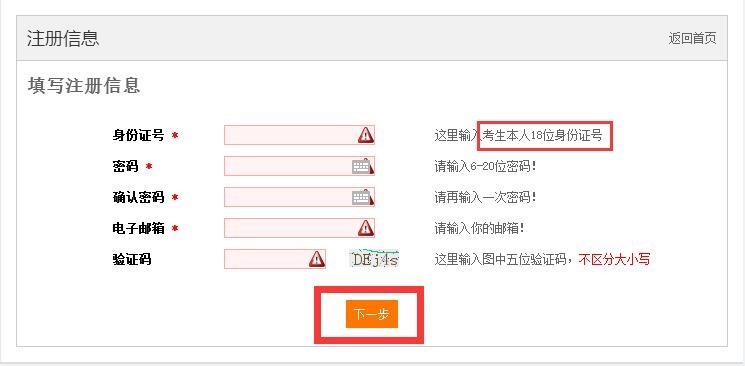 4.填写“注册信息”,注意请使用考生本人身份证号进行注册。
