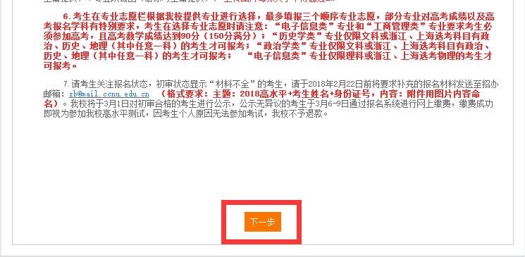 3. 特别注意“报考须知”第6、7条,鼠标拖到页面最下端点击“下一步”。