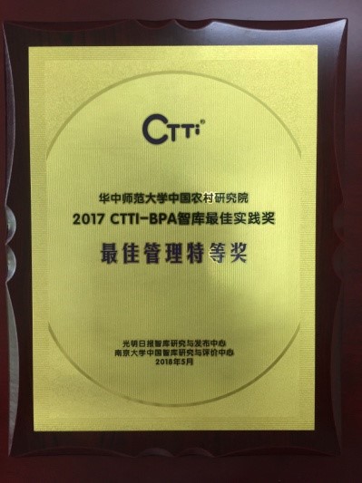 据了解,2017 CTTI-BPA智库最佳实践案例评选是光明日报智库研究与发布中心、南京大学中国智库研究与评价中心联合发起,依托中国智库索引-CTTI并结合专家评审进行的。据统计,共有23个省市自治区441个项目进行了申报,经过在线通讯评审,最终78项申报入围。经过专家组举行终评会,投票表决出51件入围2017CTTI-BPA最佳案例,中国农村发展智库平台获最佳管理奖类特等奖。