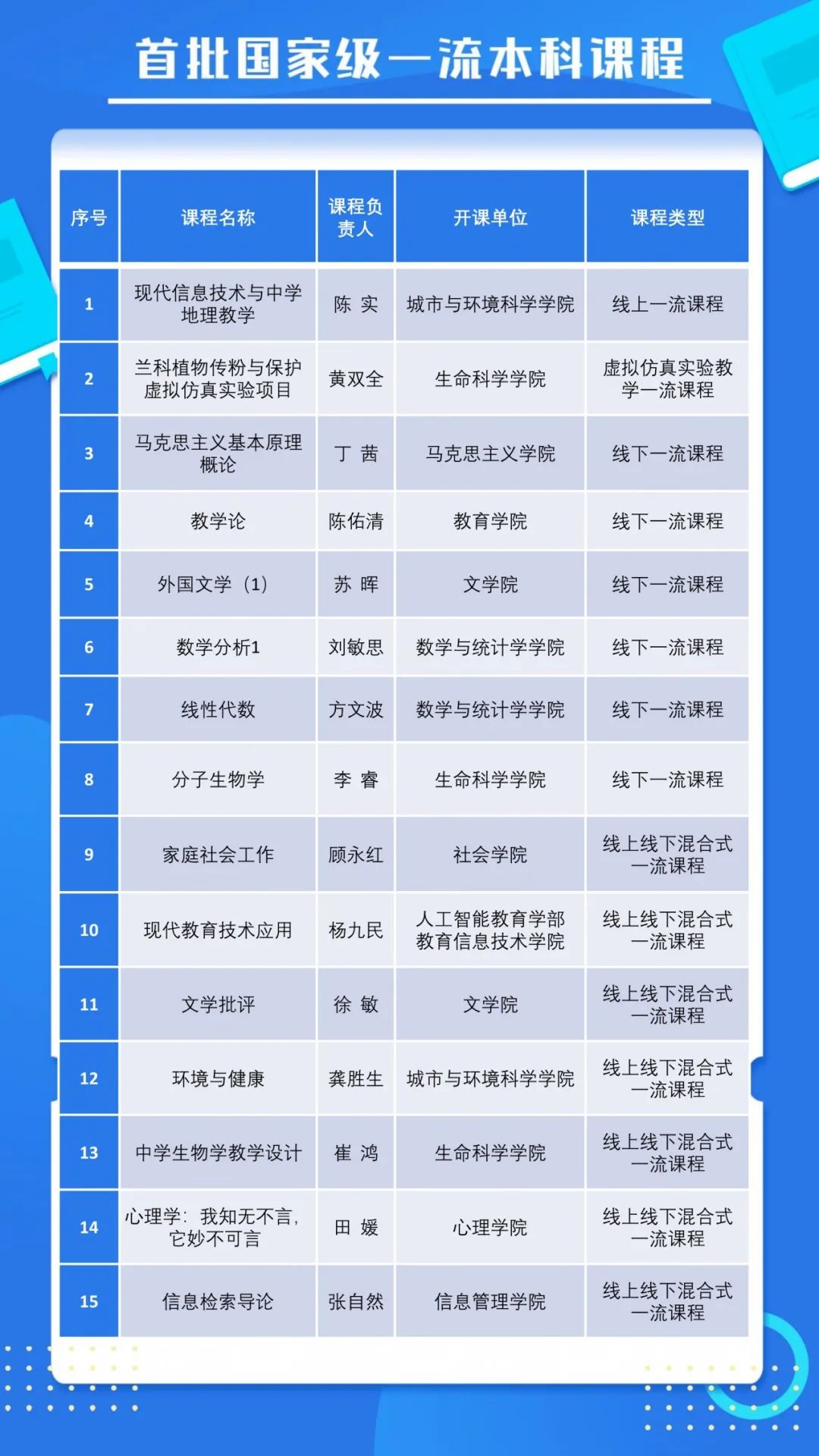 (通讯员 周兆雄)近日,教育部公示首批国家级一流本科课程认定结果,我校《现代信息技术与中学地理教学》等15门课程在总数限报的情况下入选。其中线上一流课程1门、虚拟仿真课程1门、线下一流课程6门、线上线下混合式课程7门。
