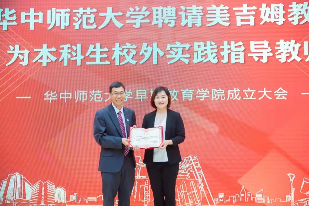 校党委副书记查道林为美吉姆授予“华中师范大学早期教育学院实习基地”标牌