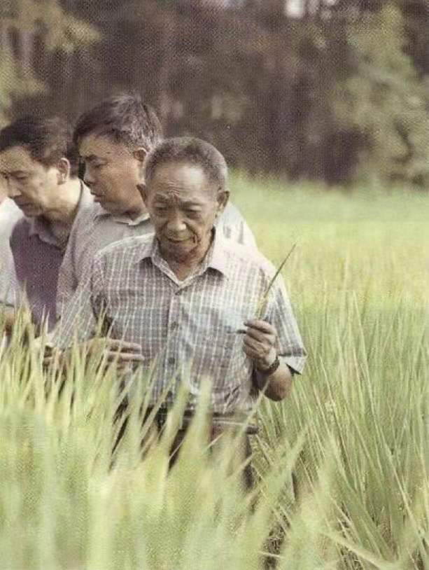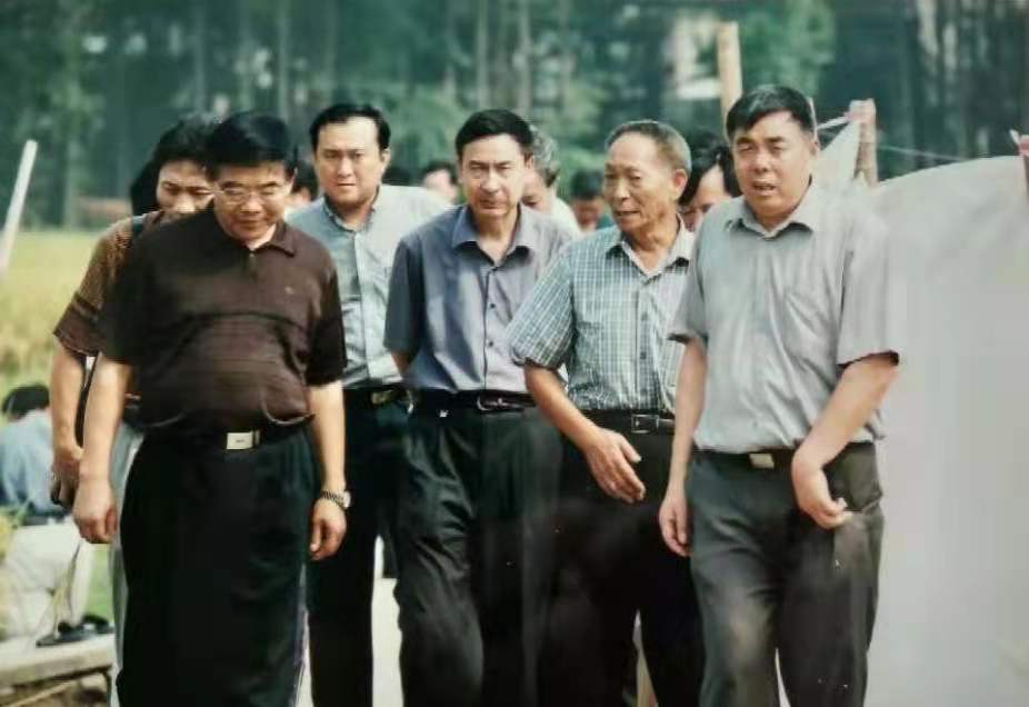 袁隆平院士在南湖试验田与蔡旭副校长(左一)、李行润教授(右一)等交谈