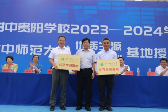 活动中,彭双阶一行参加了华中师大一附中贵阳学校的开学典礼,观看了学生的军训成果汇报,向华中师大一附中贵阳学校授“优质生源基地”和“实习实训基地”牌,希望双方在优质生源培养输送和优秀毕业生实习就业方面更加深度融合。