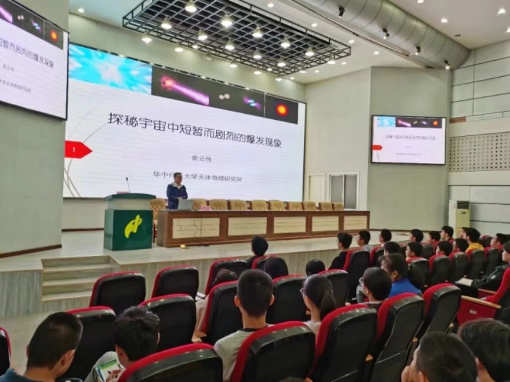当天上午,我校物理科学与技术学院副院长、国内知名天文学专家俞云伟教授在黄陂一中逸夫楼学术报告厅为该校高一年级全体同学作了一场生动的天文学科普报告。