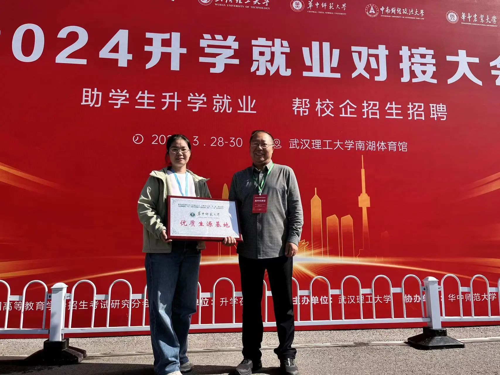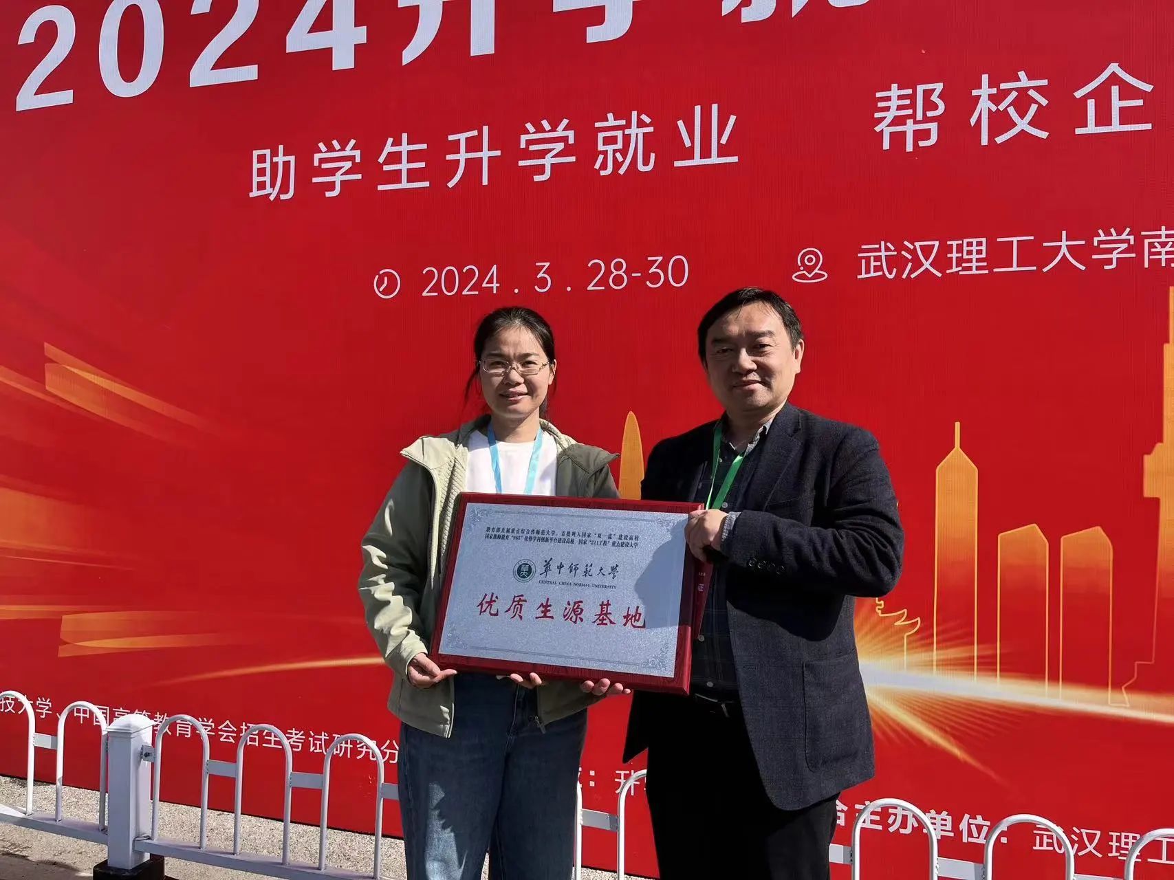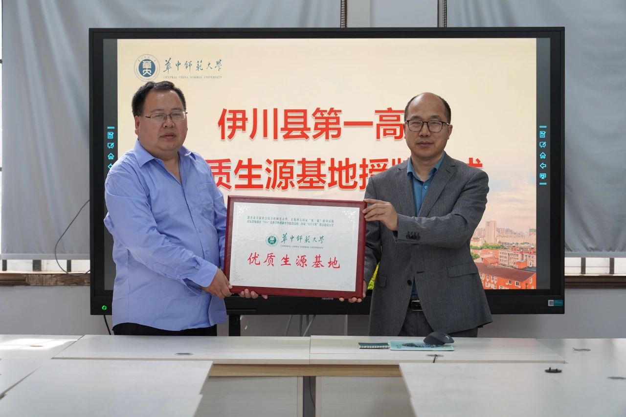 伊川县第一高中赵现生副校长与我校河南招生组王世存副教授共同完成“优质生源基地”授牌仪式。
