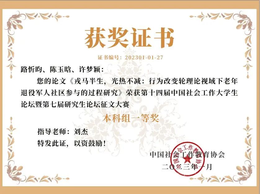 近5年,专业教师获教育部高等学校科学研究优秀成果奖(人文社会科学)三等奖1项、国家级一流课程等国家级教学奖3项、湖北省社科优秀成果奖一等奖1项、二等奖2项、三等奖1项,获国家社科基金重大项目1项、重点项目2项、一般及青年项目8项。教师指导学生获全国“挑战杯”大学生课外学术科技作品竞赛一等奖1项、二等奖1项,获中国社会工作大学生论坛暨社会工作研究生论坛一等奖8项、二等奖16项。