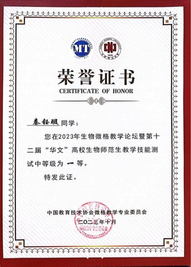学院教师刘家武、张秀红指导学生秦钰璇荣获第十二届全国“华文”高校生物师范生教学设计与教学技能大赛双料冠军
