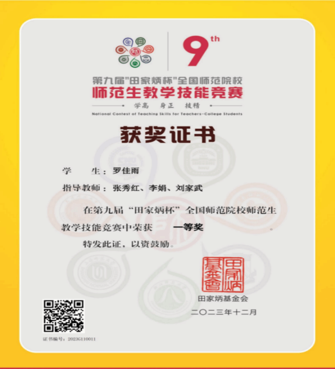 学院教师张秀红、李娟、刘家武指导学生罗佳雨荣获第九届“田家炳杯”全国师范院校师范生教学技能竞赛一等奖